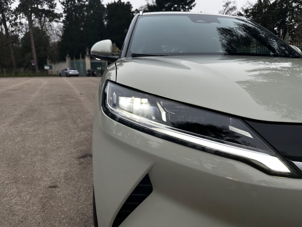 Cette impression est renforcée par le design de la face avant. BYD applique ici son langage stylistique « Dragon Face », avec des phares LED fins et effilés, qui donnent au véhicule une expression de visage agressif. L’ensemble est dynamique, moderne et plutôt réussi. Il dénote vraiment avec ce que représente un véhicule électrique chinois dans l’imaginaire collectif.