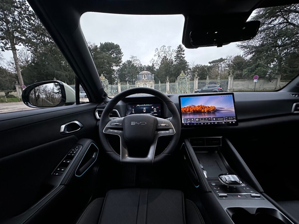 Maintenant que la partie extérieure est analysée, passons au peigne fin l’intérieur de cette voiture. Une fois installé à bord, on retrouve immédiatement ce que BYD sait bien faire. L’habitacle est propre, épuré et rassurant, avec une qualité perçue très correcte pour le niveau de prix. Le détail qui fait toujours la différence, c’est que le véhicule est équipé d’un toit panoramique qui inonde l’habitacle de lumière et est accompagné d’un pare-soleil réglable électriquement. Globalement, les matériaux sont bien assemblés, les commandes tombent naturellement sous la main, et l’ensemble inspire confiance.