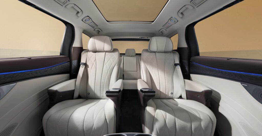 Certaines versions vont encore plus loin avec des sièges dits “Zero Gravity”, pensés pour maximiser le confort sur longs trajets. L’ensemble est complété par une ambiance intérieure soignée, mêlant cuir, inserts bois et éclairage d’ambiance, avec un travail particulier sur l’isolation acoustique. Dans le communiqué du constructeur, on apprend que l’expérience à bord se rapproche ainsi davantage d’un salon roulant que d’un monospace traditionnel. Alléchant !